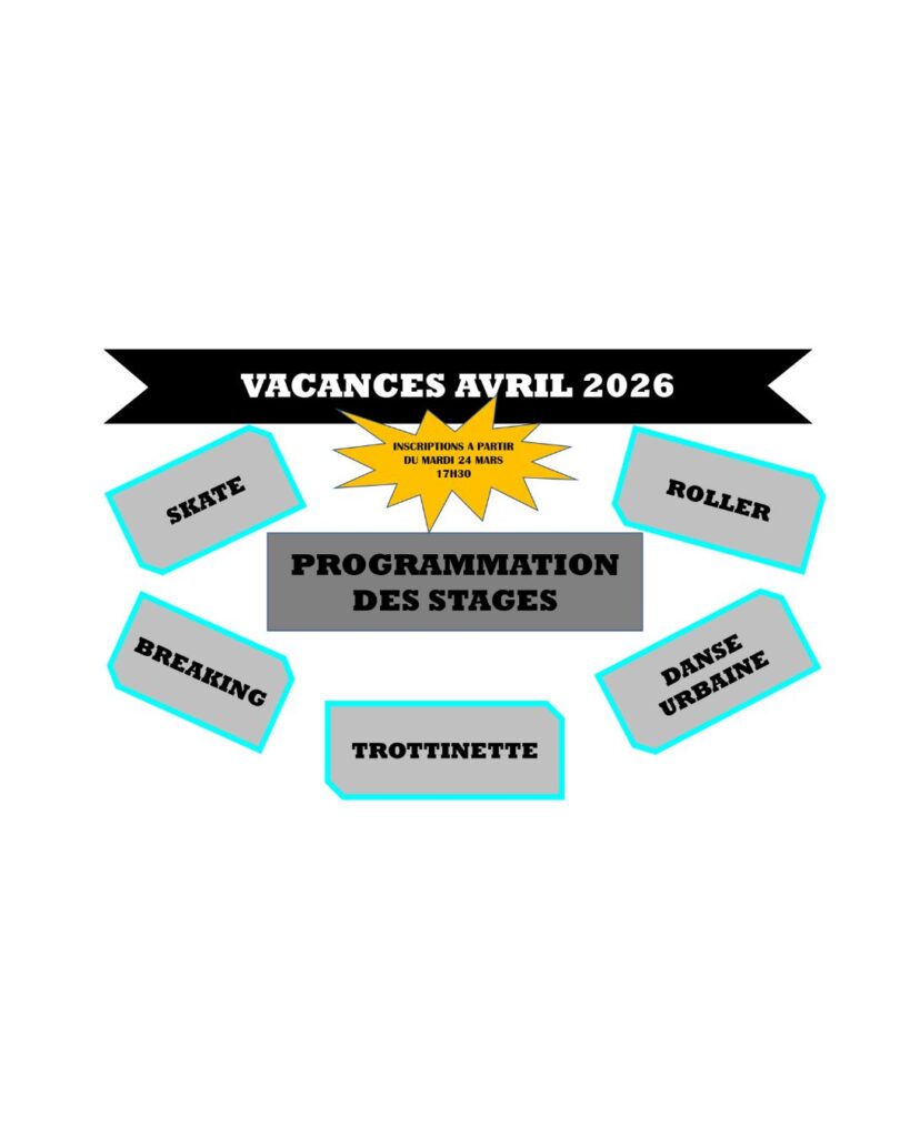 Voici la programmation des stages pour les vacances d’avril. Renseignements et inscriptions au Spot ou au 02.43.14.58.70 à partir du 24 mars à 17h30.