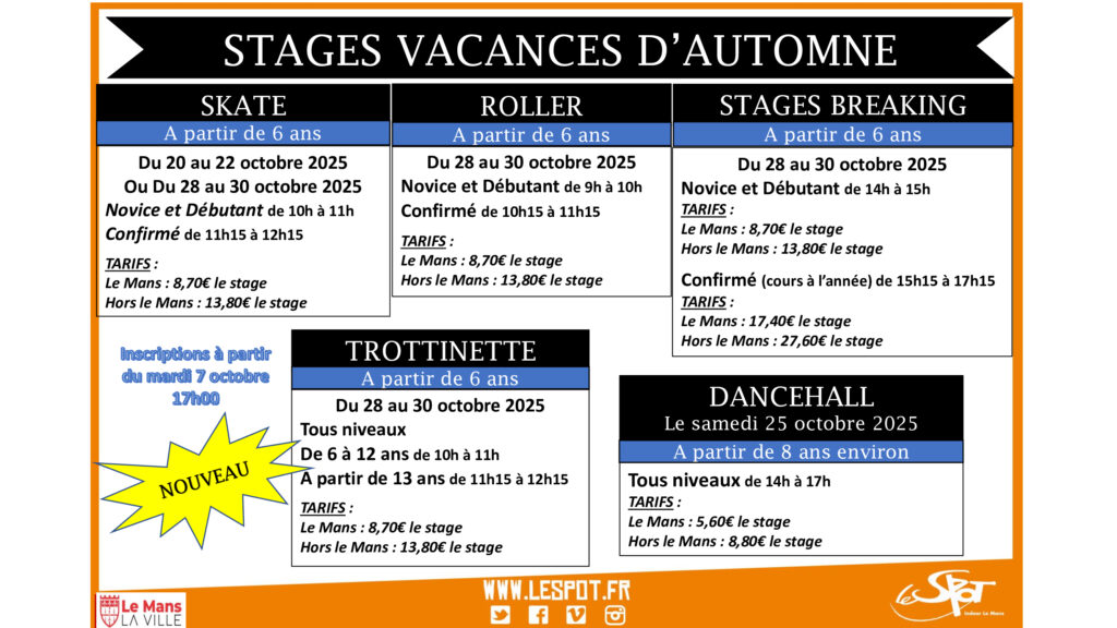 Voici la programmation des stages pour les vacances de la Toussaint.